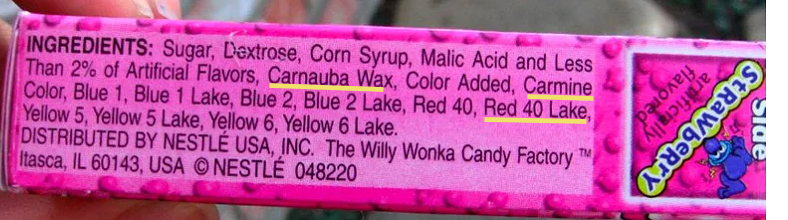 These are colorants. And are made from crushed insects. This popular colorant is used to impart a deep red shade to fruit juices, gelatins, candies shampoos and more. When used as a food additive, the dye must be labelled on packaging labels. Sometimes carmine is labeled as E120.