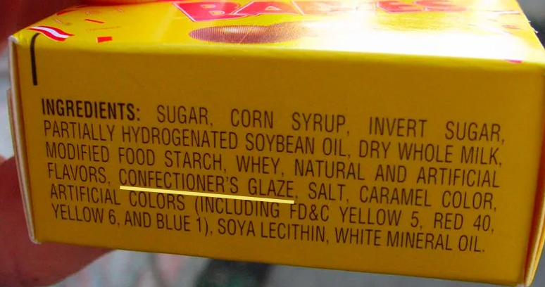Natural polymer derived from certain species of lice from India. Comes from the female lac bug. It is crushed bugs. It is used as a coating found in products like confectionary, fruits and candy. They use it to coat candy and make it look shiny. Also called Confectioner’s Glaze!