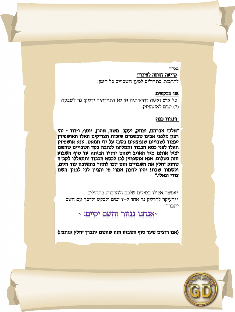 אלקי אברהם, יצחק, יעקב, משה, אהרן, יוסף, ו-דוד – יהי רצון מלפני אבינו שבשמים שזכות הצדיקים האלו האושפיזין יעמוד לשבויים שנמצאים בשבי על ידי חמאס. אנא אושפיזין תעלו לפני כסא הכבוד ותמליצו לטובה בעד השבויים שהשם יציל אותם מיד האויב ושהם יחזרו הביתה עד סוף השבוע הזה בשלום. אנא אושפיזין לכו לכסא הכבוד ותתפללו לקב”ה שהוא יחלץ את השבויים והם יזכו לחזור בתשובה עוד היום, ולשמור שבת! יהיו לרצון אמרי פי והגיון לבי לפניך השם צורי וגאלי